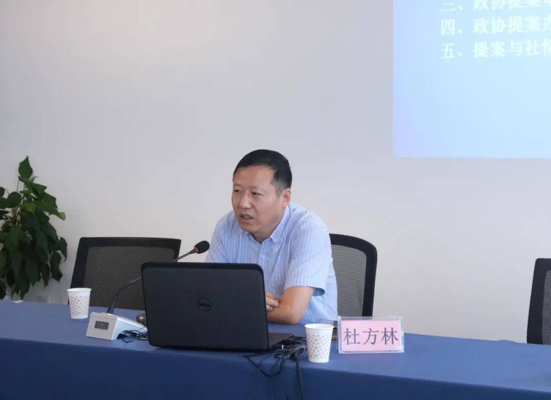 市政协提案委员会主任杜方林开展主题为“写好政协提案,积极参政议政”的专题授课。从政协提案概念、政协提案撰写、政协提案审查、政协提案办理、提案与社情民意五大方面为参会人员梳理政协提案的步骤与程序,并传授写好政协提案与社情民意的宝贵经验。