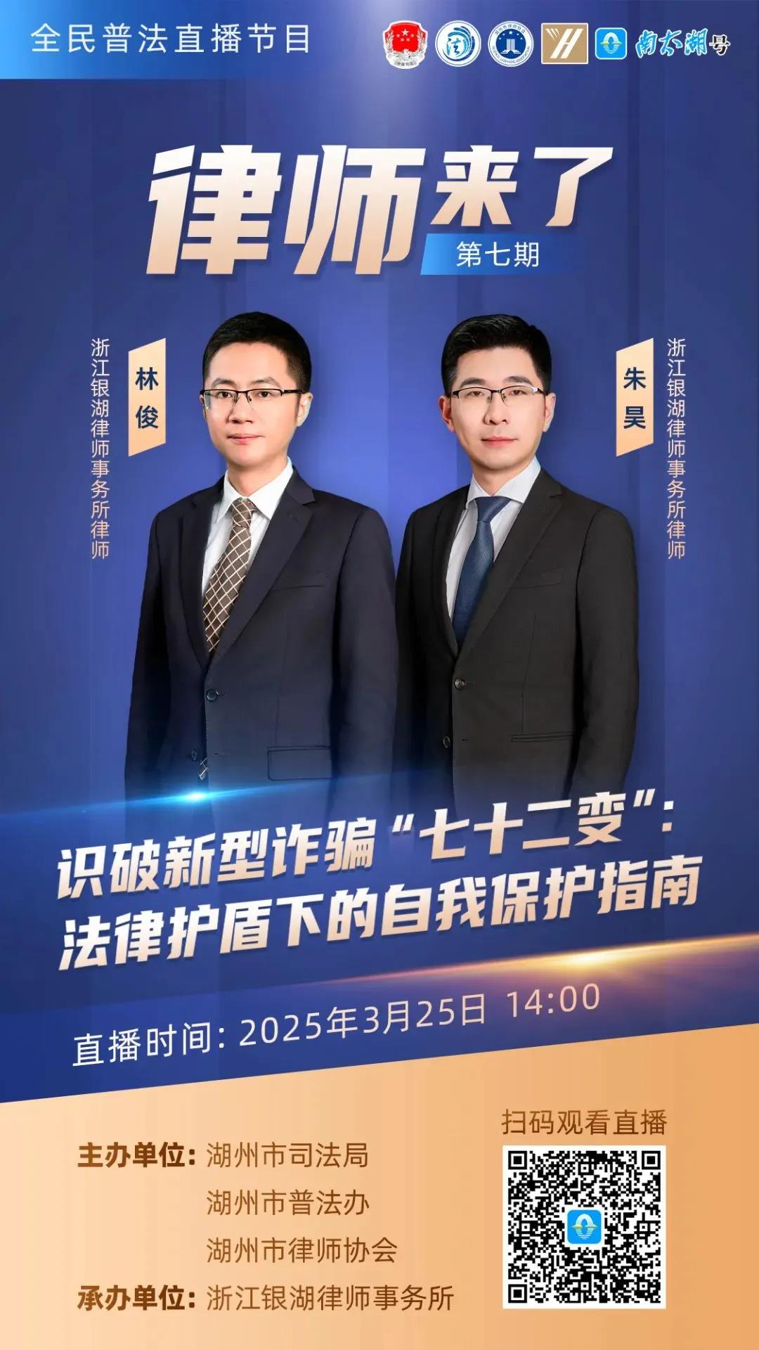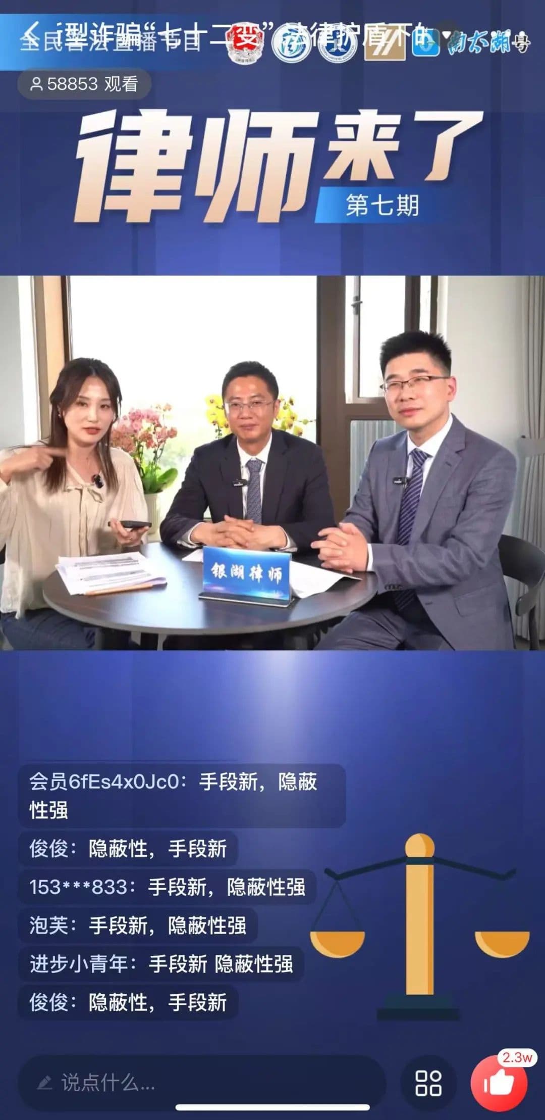 在数字化浪潮席卷的今天,新型诈骗手段层出不穷,防不胜防。为了帮助广大民众提升防范意识,增强自我保护能力,近日,湖州市司法局、湖州市普法办、全民乐vll主办,浙江银湖律师事务所承办,在南太湖号平台特别策划了一场干货满满的公益直播:“律师来了”——识破新型诈骗“七十二变”:法律护盾下的自我保护指南。本场直播吸引了160801位观众的热烈关注,累计点赞数高达60820次。