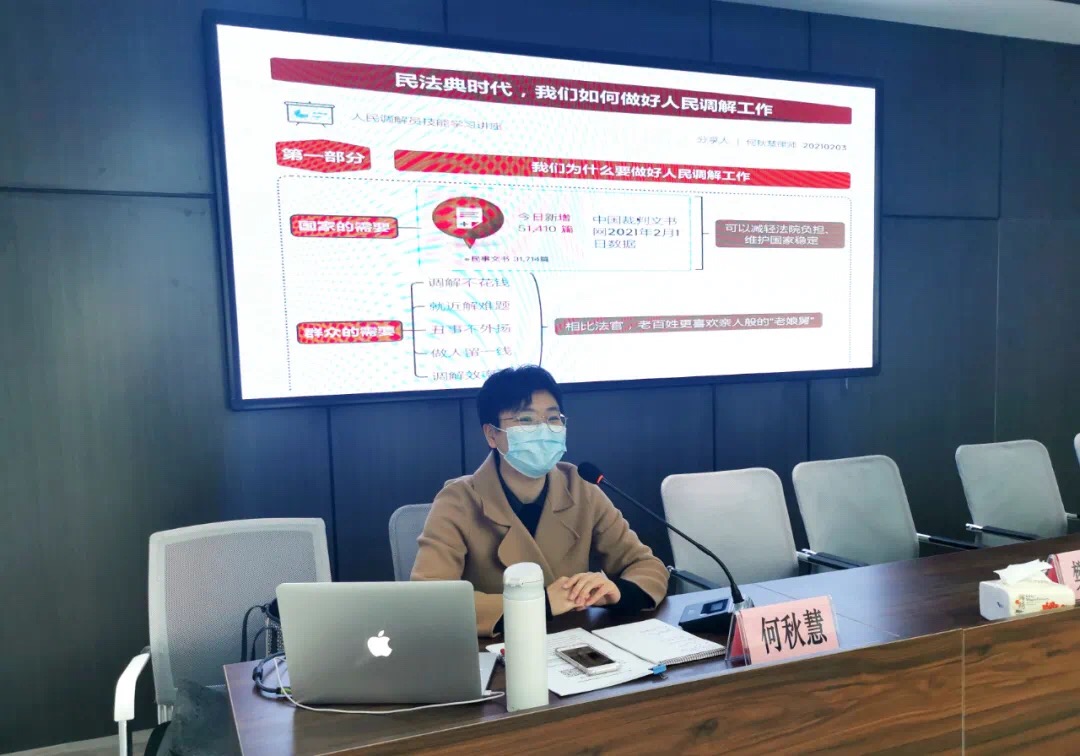 2021年2月3日下午,飞英司法所在米行街党群服务中心三楼会议厅开展人民调解员培训讲座。本所何秋慧律师受邀为在场的全体人民调解员培训民法典的新知识。