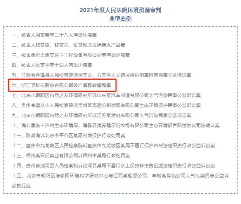 6月5日,最高人民法院发布2021年度人民法院环境资源审判典型案例。其中,"浙江某科技股份有限公司破产清算转重整案"入选。该案由湖州市中级人民法院审理,由浙江泽大(湖州)律师事务所担任管理人。