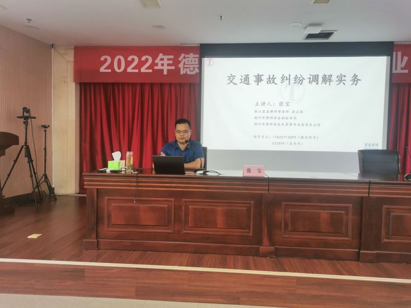 2022年6月21日、23日上午,浙江苕溪律师事务所副主任张宝律师、专职律师王志智律师分别应邀为参加2022年德清县人民调解工作业务培训班的人民调解员讲授交通事故纠纷调解实务。来自德清县内各乡镇、街道、司法所、村、社区等百余位人民调解员参加本次培训。