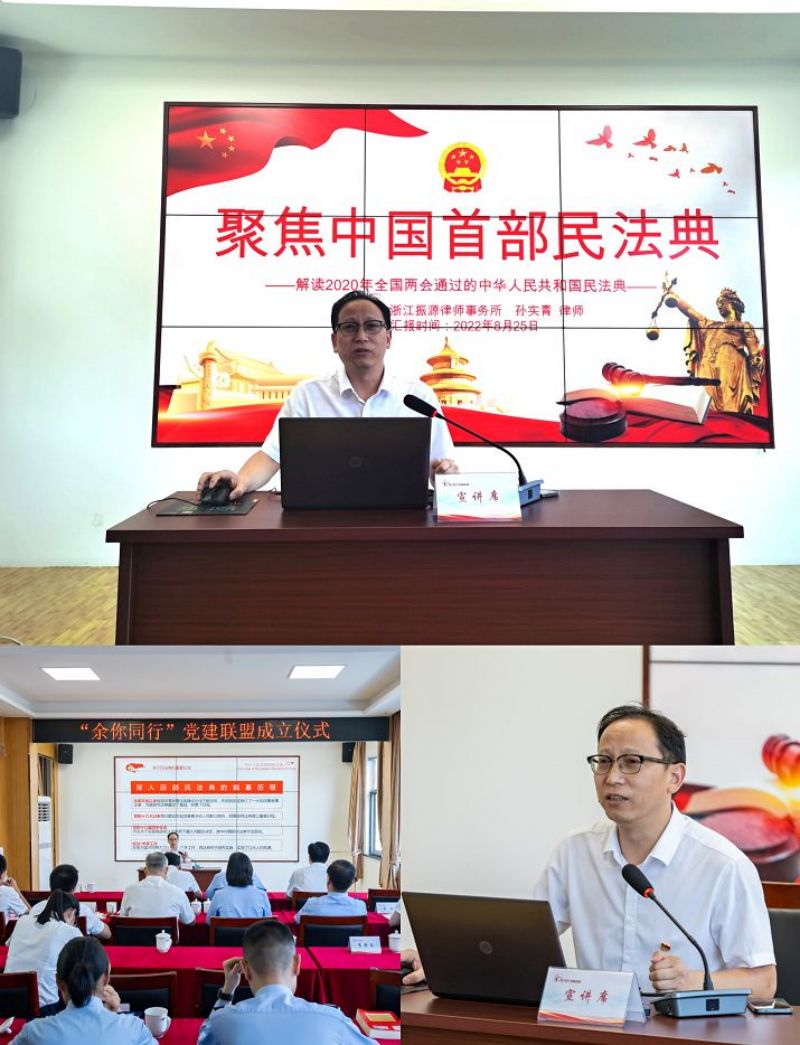 浙江振源律师事务所副主任孙实青律师为在场领导、嘉宾解读《中华人民共和国民法典》,通过实际案例宣讲《民法典》中的部分特色法律条款,深入浅出、通俗易懂,赢得在场听众们的高度赞扬!