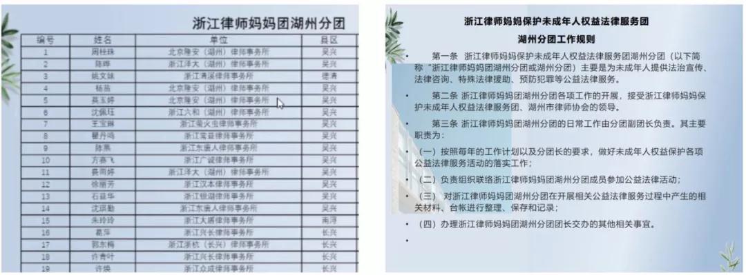 湖州分团根据浙江省律师协会妈妈保护未成年人权益法律服务团的工作部署和要求而成立,以“保护未成年人的合法权益”为宗旨,切实为湖州的未成年人提供法律帮助,为未成年人健康成长保驾护航、筑牢法律防线,为湖州的社会稳定和未来发展贡献力量。