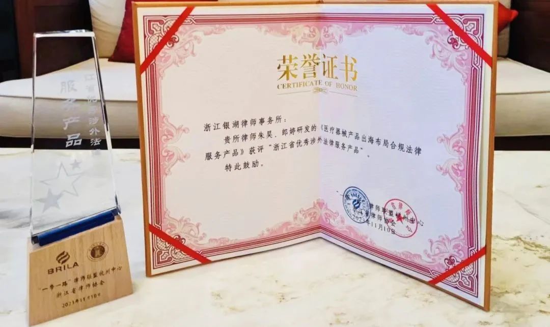 20231110日,在“一带一路”倡议提出十周年之际,由“一带一路”律师联盟杭州中心、浙江省律师协会主办,“一带一路”律师联盟、浙江省发展和改革委员会、浙江省司法厅支持,以“服务开放提升,打造法治化营商环境最优省”为主题的浙江省第二届涉外法律服务论坛在杭州举办。论坛上,我市浙江银湖律师事务所朱昊律师、郎婷律师申报的《医疗器械产品出海布局合规法律服务产品》获得了“浙江省优秀涉外法律服务产品”荣誉。