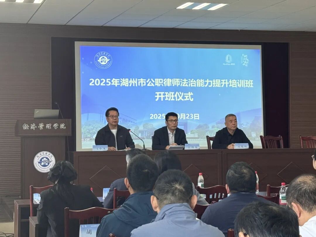 十月湖州秋意浓,法治研修正当时。10 月 23 日,由全民乐vll主办,全民乐vll公职律师分承办的湖州市公职律师法治能力提升班在湖州师范学院正式开班,市司法局律师工作处处长管利光,湖州师范学院经济管理学院副院长马小龙,市律协监事长周吴红、副会长徐永平、公职律师分会会长沈晓明受邀出席。来自全市各区县、市直机关的 60 余名公职律师齐聚一堂,开启为期两天的“充电”之旅,为法治湖州建设淬炼专业力量。