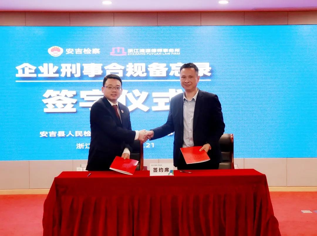 本次论坛中,安吉县人民检察院与浙江浦源律师事务所签订《企业刑事合规备忘录》,将在刑事合规领域一起探索、研究企业合规管理制度,提高企业的自我风险防范能力。