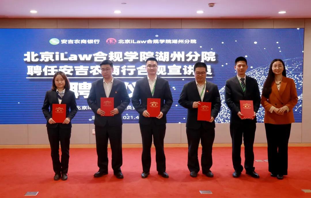本次论坛,还举行了合规宣讲员聘任仪式。北京iLaw合规学院湖州分院聘任安吉农商行合规宣讲员。