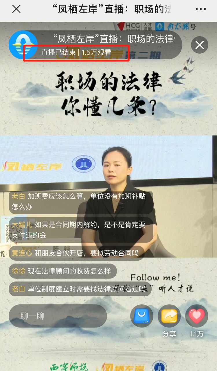 此次直播获得1.5万多人次的观看和聆听。课堂中,各位听众还提出了“试用期的期限应该多久、实习期工资不给怎么办、加班费应该怎么算”等多个职场中会遇到的问题,陈晔律师结合社会热点和自身办案经验,毫不吝啬地进行了解答和分享。此次直播可谓干货满满,线上网友纷纷点赞并留言表示陈律师的解答易懂又实用。