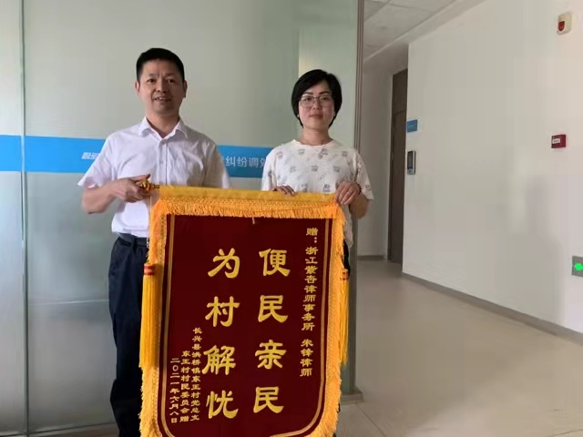 2021年7月7日,长兴县洪桥镇东王村钦伟娟书记一行特地来到长兴县司法局法管科,向东王村法律顾问朱锋律师赠送锦旗。“便民亲民,为村解忧”短短六个字是东王村村民委员会对朱锋律师村法律顾问工作的高度认可。
