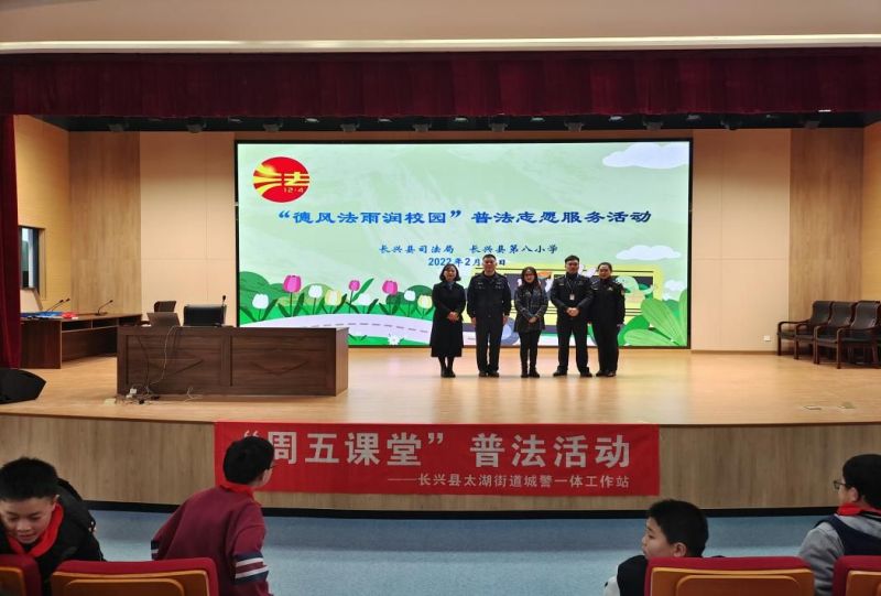 2022年2月22日下午,长兴县司法局联合太湖司法所、城东派出所、开发区综合执法中队等多家单位在长兴县第八小学开展“德风法雨润校园”普法志愿服务活动。