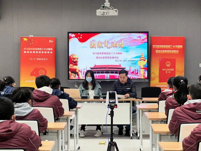 湖东街道司法所联合浙江六和(湖州)律师事务所、湖州四中教育集团毗山校区于12月8日在校园开展宪法宣传活动。