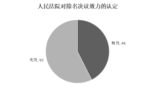 回到《公司法解释三》第17条,该条款文本在适用条件上局限于“未履行出资义务或者抽逃全部出资”,这与股东失权制度更为接近。而在适用程序和法律后果上又规定“公司以股东会决议解除该股东的股东资格”,更近似股东除名制度。这样的立法错位,不仅会对不同制度的理论研究产生误导,还会让制度的适用价值大打折扣。笔者在alpha上以“股东除名”作为关键词查询到的108份案例作为有效样本进行统计,其中法院判决解除股东资格的股东会决议有效的有46份,判决无效的有62份,比例为1:1.3。可见,实务中对股东除名决议效力认定存在争议,除名制度的实施存在很大不确定性。
