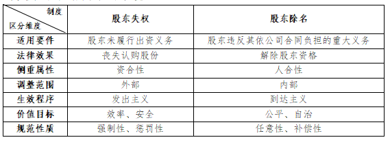 从两个制度的具体规则分析,股东失权和股东除名是两个截然不同的制度。首先,从制度侧重点来看,股东失权是为督促股东履行出资义务,保证公司资本充实,其侧重于公司的资合性。而股东除名是为踢出异己股东,保证公司内部股东关系和睦,其侧重于公司的人合性。其次,从规范调整的法律关系来看,股东失权制度是为确保公司资本充足,从而保障公司债权人的利益,其着眼点在于公司与债权人之间的外部关系,而股东除名是为协调公司股东间的关系,其着眼于股东间的内部关系。再次,从规则运行的程序上来看,股东失权经由公司发出失权通知即生效,其更注重维护效率和交易安全,而股东除名须经公司股东会作出决议,并经送达除名股东后方生效,其更注重公司内部股东之间的平等。最后,从规则适用对象承担的后果来看,股东失权会令股东份额被没收,其更具有强制性和惩罚性,而股东除名,除名股东有权请求公司返还其出资份额对应的财产价值,其目的不在于惩罚存在重大事由的股东,而在于保障公司继续经营免受内部关系不和谐因素的干扰。