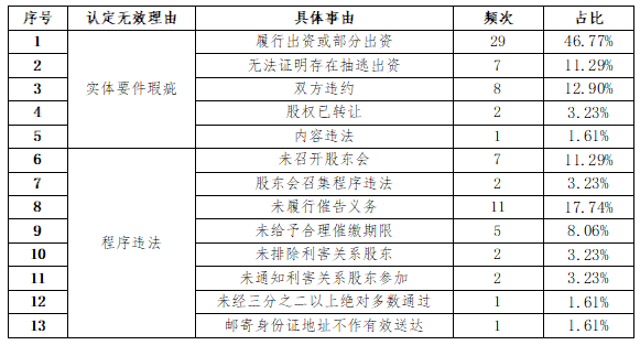 其中,62份判决无效的生效法律文书中,因股东已履行出资义务或部分出资义务及无法证明存在抽逃出资等实体要件瑕疵而判决无效的,有47份。因程序违法为由认定无效的有23份,其中具体程序违法的事项包括:未召开股东会、股东会召集程序违法、未履行催告义务、未给予合理催缴期限、未排除利害关系股东表决权、未通知利害关系股东参加、决议表决未达到三分之二以上绝对多数通过、解除通知未成功送达。