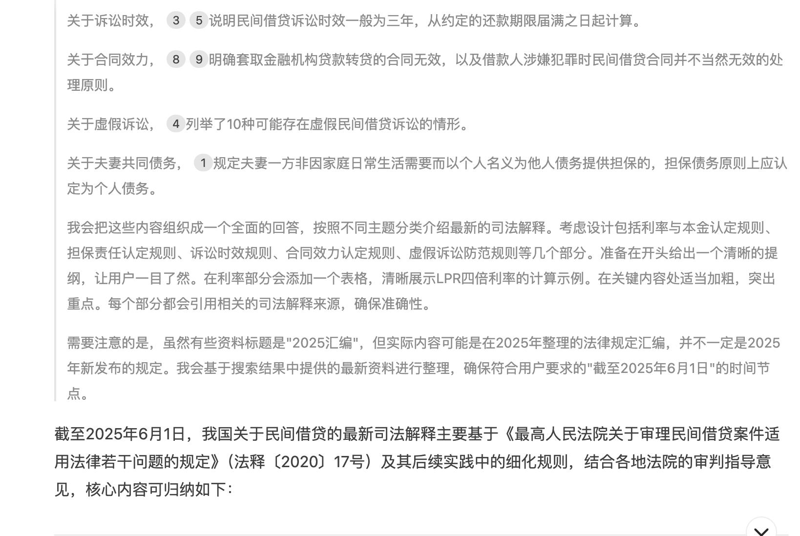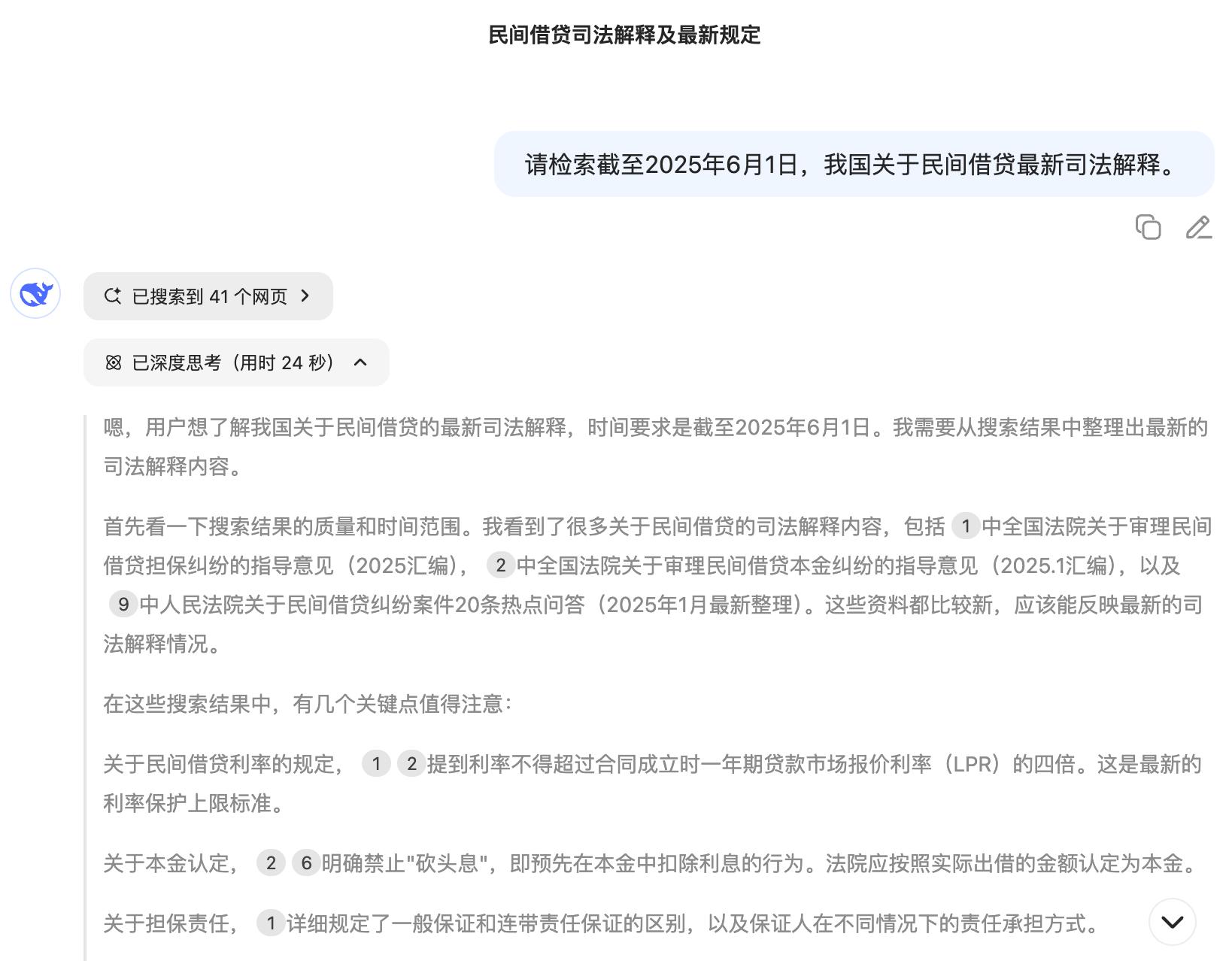 以请求Deepseek生成一份关于“民间借贷司法解释及最新规定”检索报告为例。在网页版Deepseek-R1对话窗口输入以下提示词:“请检索截至2025年6月1日,我国关于民间借贷最新司法解释。”Deepseek在检索41个网页、深度思考24秒后,生成以下思考结果:“截至2025年6月1日,我国关于民间借贷的最新司法解释主要基于《最高人民法院关于审理民间借贷案件适用法律若干问题的规定》(法释〔2020〕17号)及其后续实践中的细化规则。”