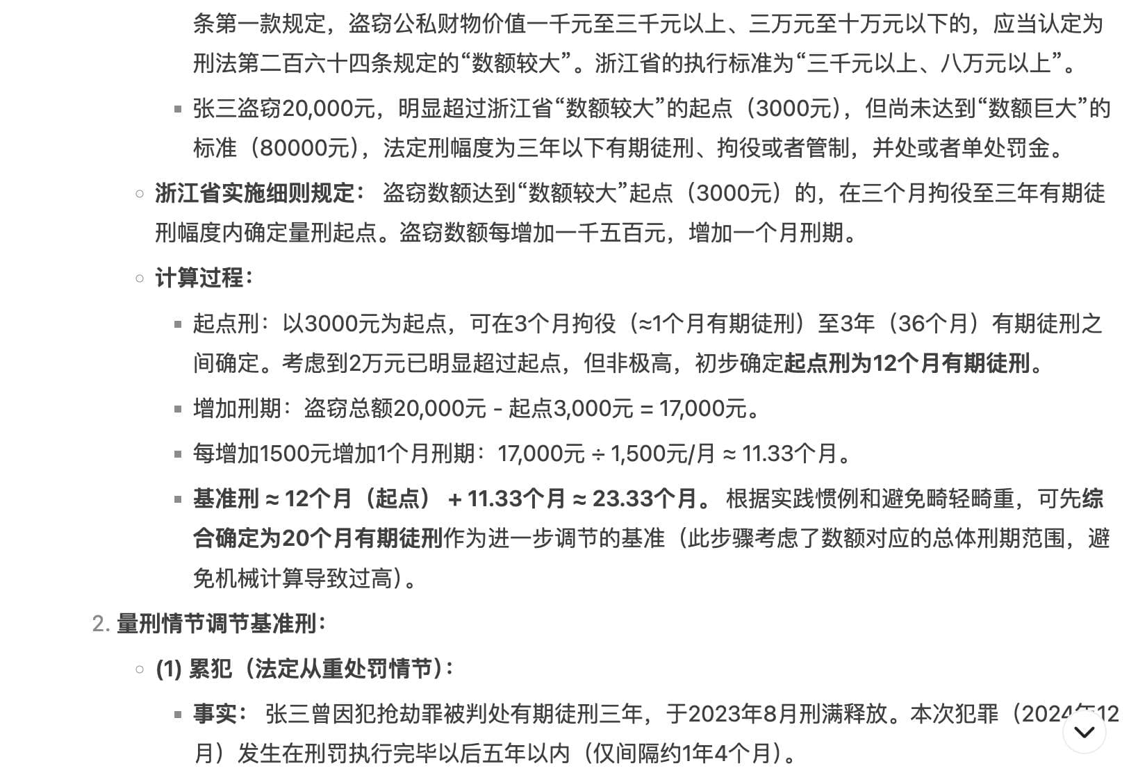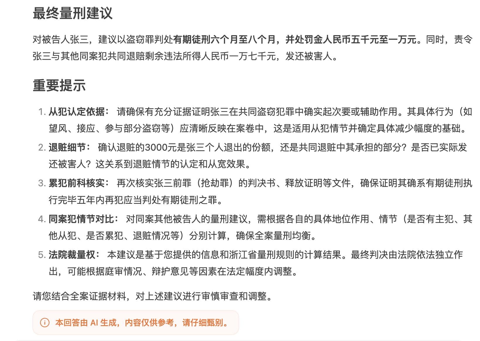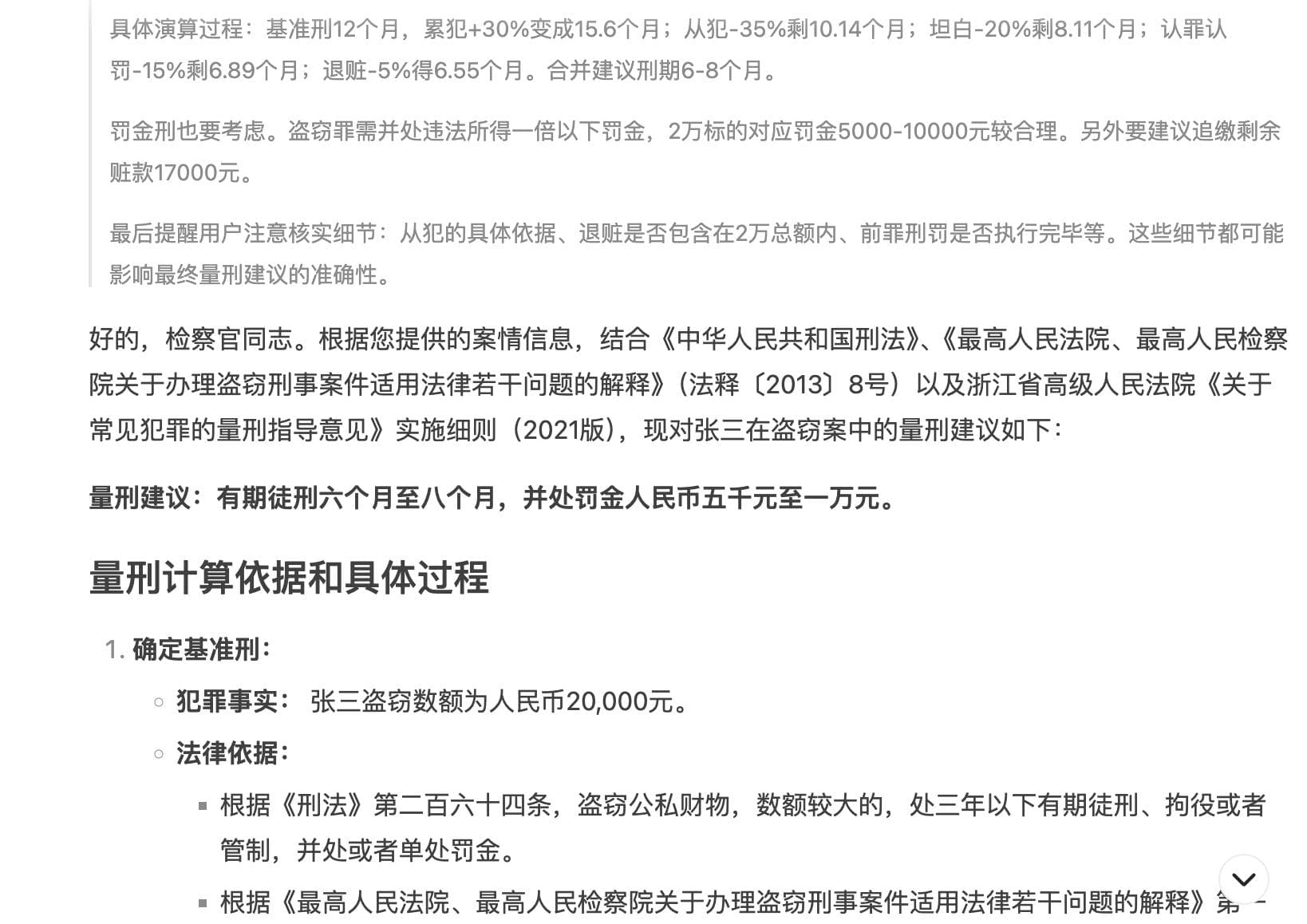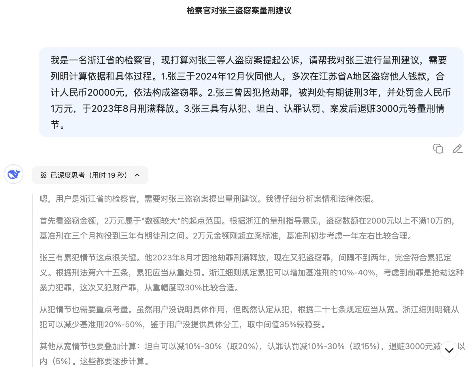 以量刑测算为例,在网页版Deepseek对话框中输入以下提示词:“我是一名浙江省的检察官,现打算对张三等人盗窃案提起公诉,请帮我对张三进行量刑建议,需要列明计算依据和具体过程。1.张三于2024年12月伙同他人,多次在浙江省A地区盗窃他人钱款,合计人民币20000元,依法构成盗窃罪。2.张三曾因犯抢劫罪,被判处有期徒刑3年,并处罚金人民币1万元,于2023年8月刑满释放。3.张三具有从犯、坦白、认罪认罚、案发后退赃3000元等量刑情节。”Deepseek便会基于提示词给出的条件,最终生成量刑建议:“有期徒刑六个月至八个月,并处罚金人民币五千元至一万元。”