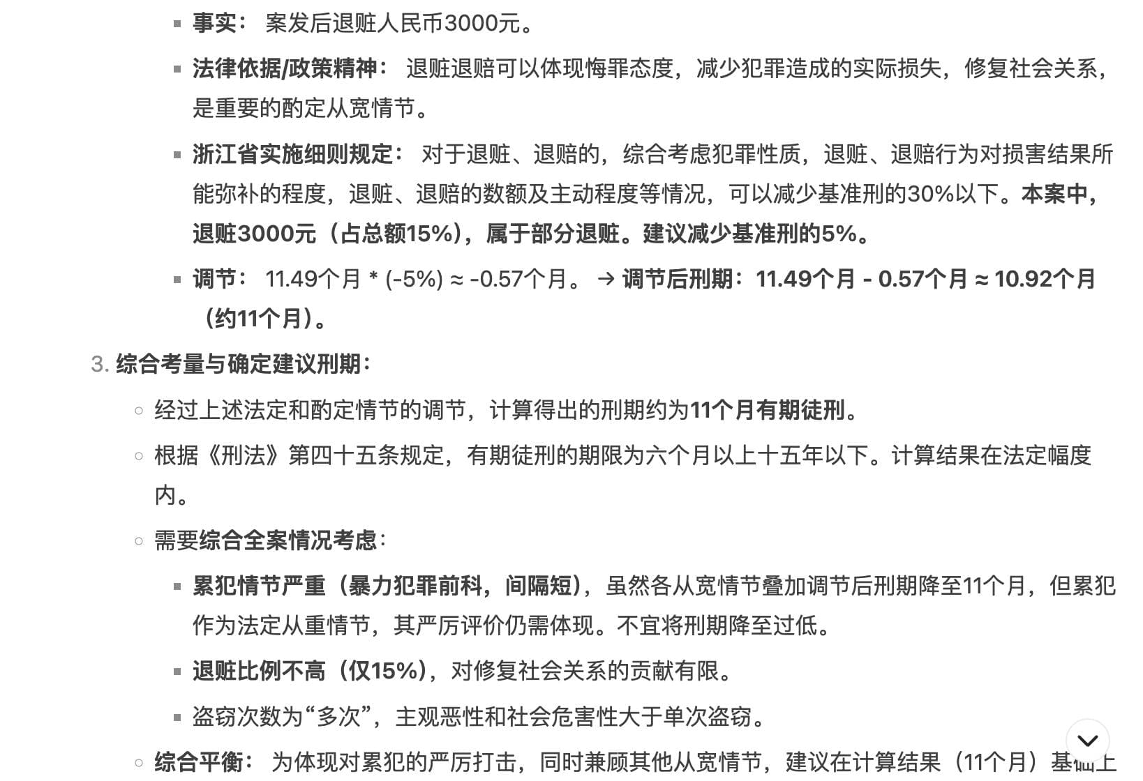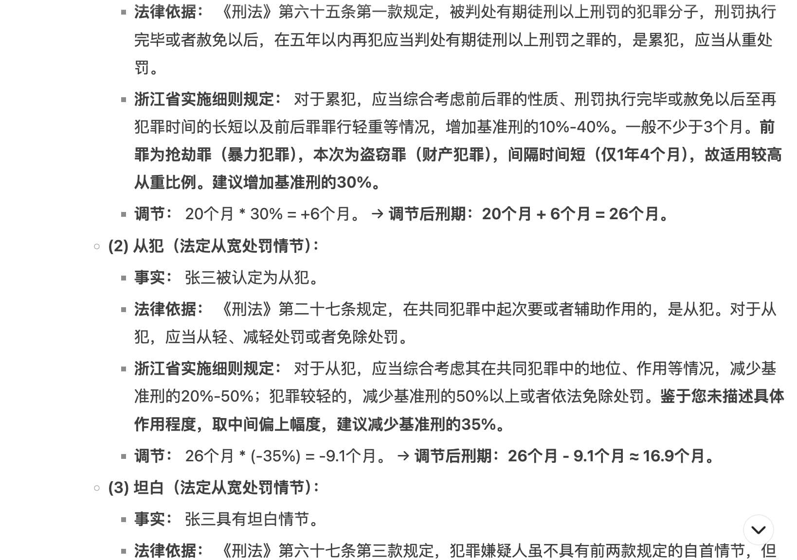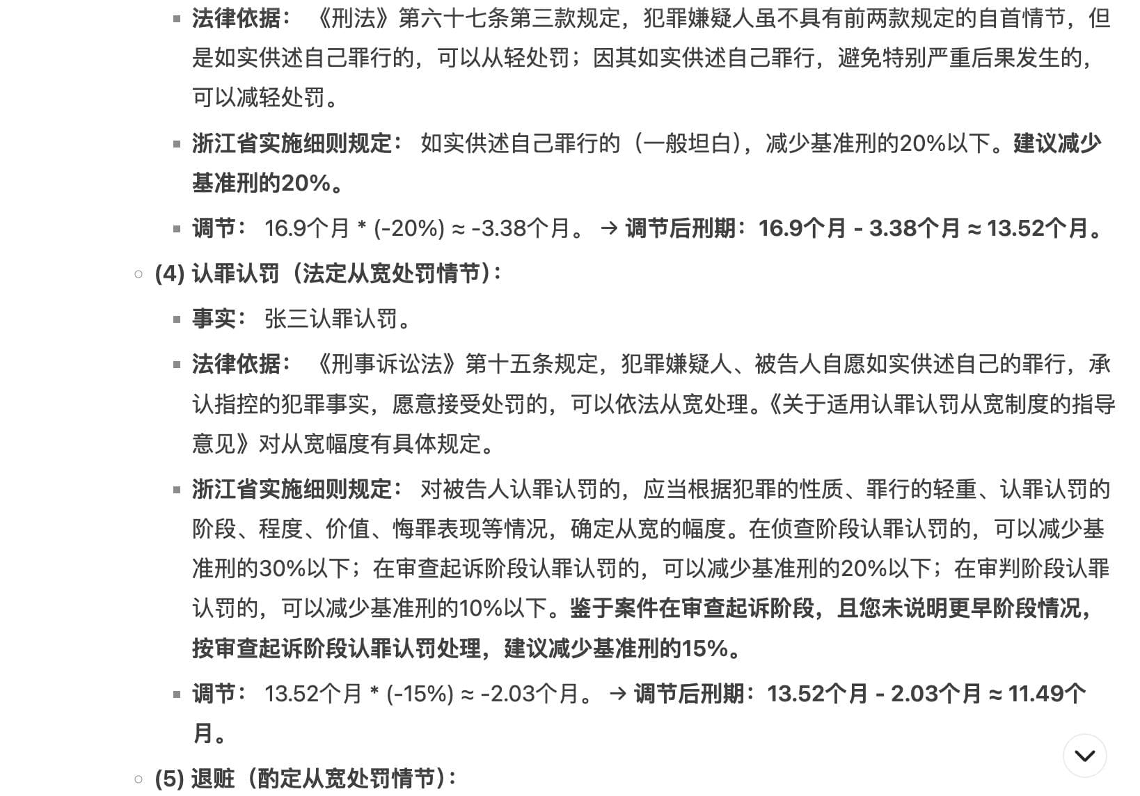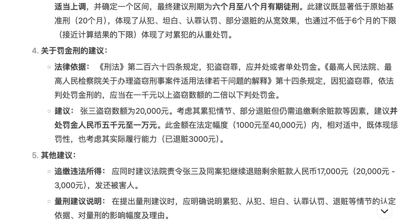 以量刑测算为例,在网页版Deepseek对话框中输入以下提示词:“我是一名浙江省的检察官,现打算对张三等人盗窃案提起公诉,请帮我对张三进行量刑建议,需要列明计算依据和具体过程。1.张三于2024年12月伙同他人,多次在浙江省A地区盗窃他人钱款,合计人民币20000元,依法构成盗窃罪。2.张三曾因犯抢劫罪,被判处有期徒刑3年,并处罚金人民币1万元,于2023年8月刑满释放。3.张三具有从犯、坦白、认罪认罚、案发后退赃3000元等量刑情节。”Deepseek便会基于提示词给出的条件,最终生成量刑建议:“有期徒刑六个月至八个月,并处罚金人民币五千元至一万元。”