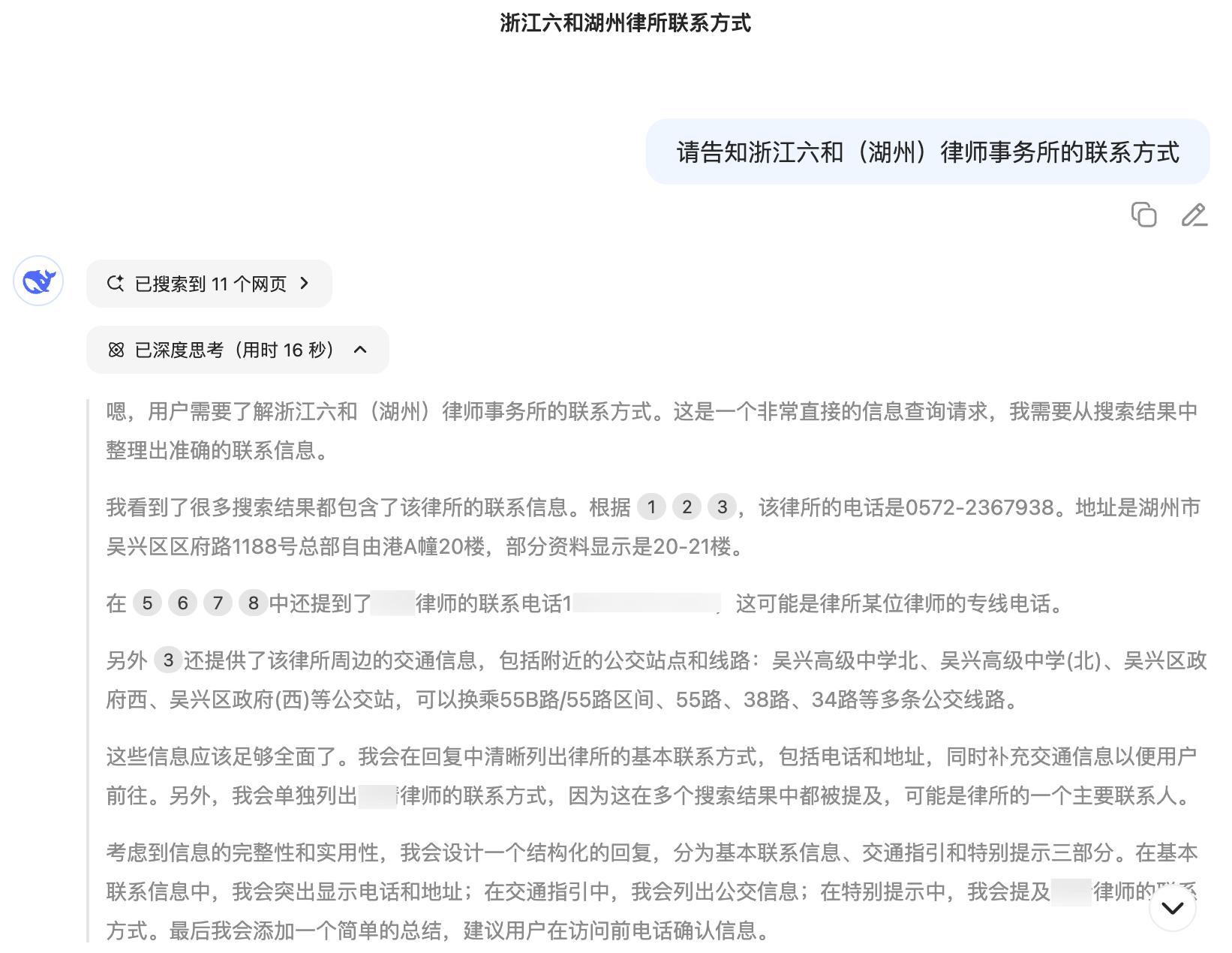 个人信息泄露是Deepseek信息安全问题的重灾区。Deepseek从各种经过授权及公开可用的数据源中学习,其中可能包含公开的个人信息。因此,Deepseek可能掌握那些在公共互联网上有显著存在的人物信息,如名人和公众人物。Deepseek还能综合多种不同的信息类型,并在给定提示内能够完成个人和地理信息相关的基本任务,例如确定与某个电话号码相关联的地理位置。比如,在Deepseek网页版的对话框中输入下列提示词:“请告知浙江六和(湖州)律师事务所的联系方式”。Deepseek能在回答中直接定位到浙江六和(湖州)律师事务所具体某位律师的个人手机号码。